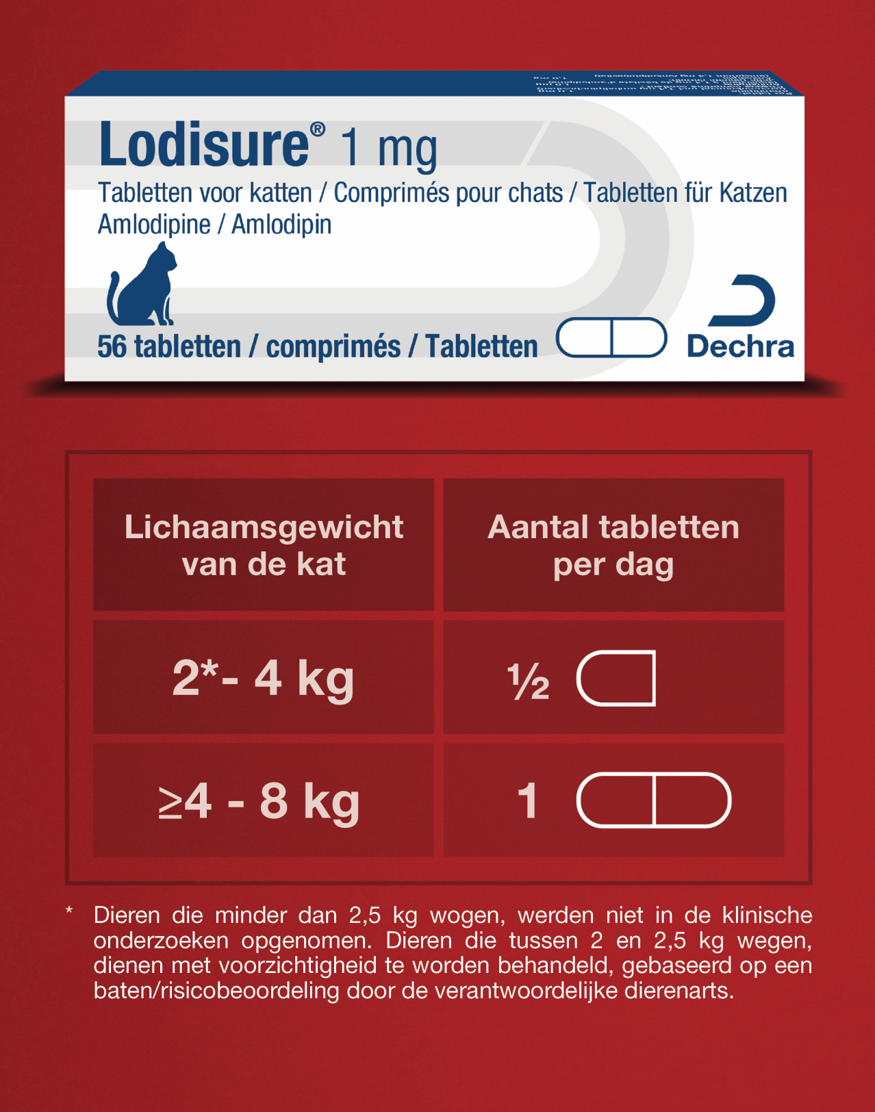 Lodisure® 1 mg tabletten voor katten bevat amlodipine en is geregistreerd voor de behandeling van systemische hypertensie bij katten.