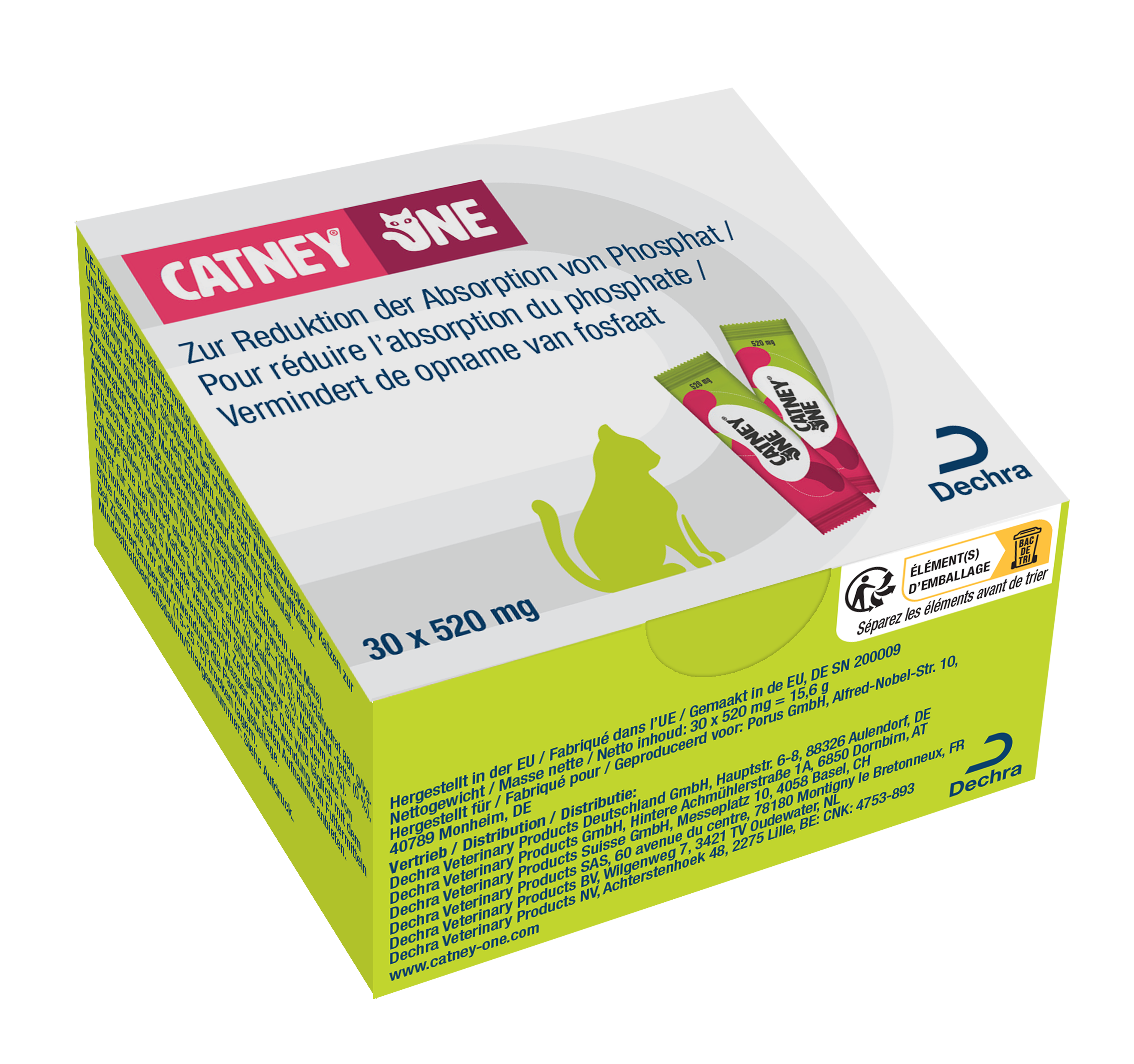 Catney One van Dechra (voor katten) is een fosfaatbinder op basis van lanthaancarbonaat, belangrijkste eigenschappen ten opzichte van andere fosfaatbinders: